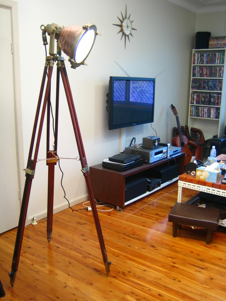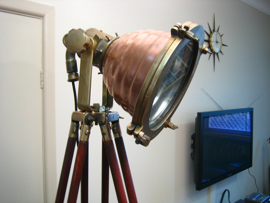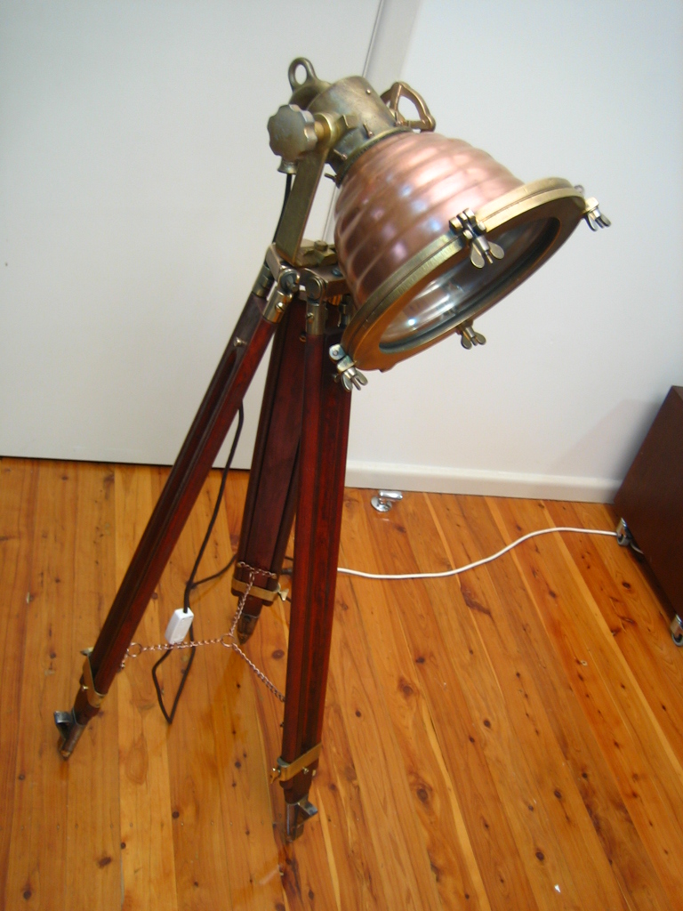 The lamp head polished and the high watt globe replaced with a regular household globe. Placed on an antique surveyors tripod with matching brass linkages. A very rare and impressive piece that has been given a second life.
