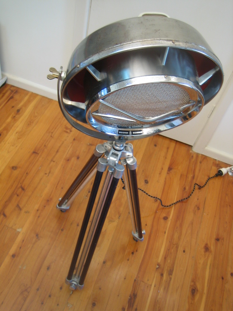 I came across this piece by chance and had intended restoring it as the industrial fan it was but when I pulled it apart, the transformer was burnt out. Circumstances decided its fate, so it has been rewired with 2 light fittings that allow the original switch to turn on one or both globes as desired. It emits a white light from the centre piece and a soft red glow from inside the surround.