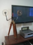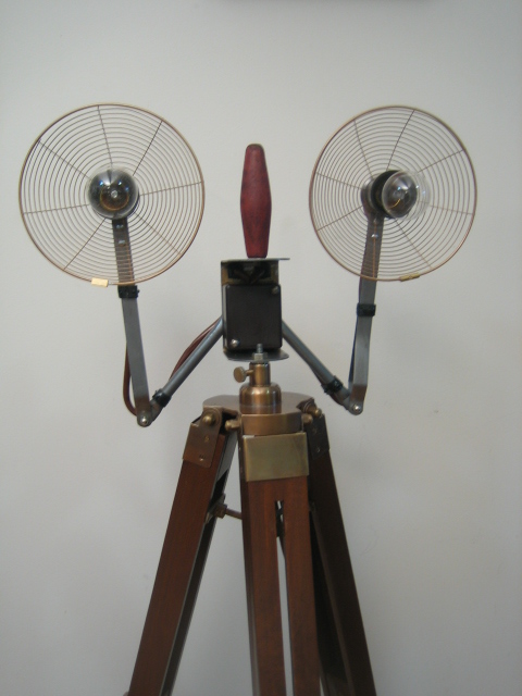 An original 1950’s handheld photography light converted into a unique designer home office floor lamp on tripod.