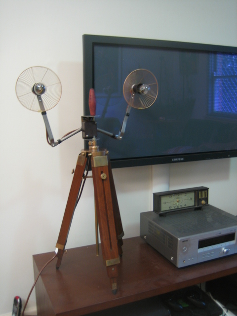 It has been mounted on a designer solid teak tripod. The legs are collapsible, making it a great table lamp as well. A wonderful vintage industial tripod lamp to give your place that custom designer look.